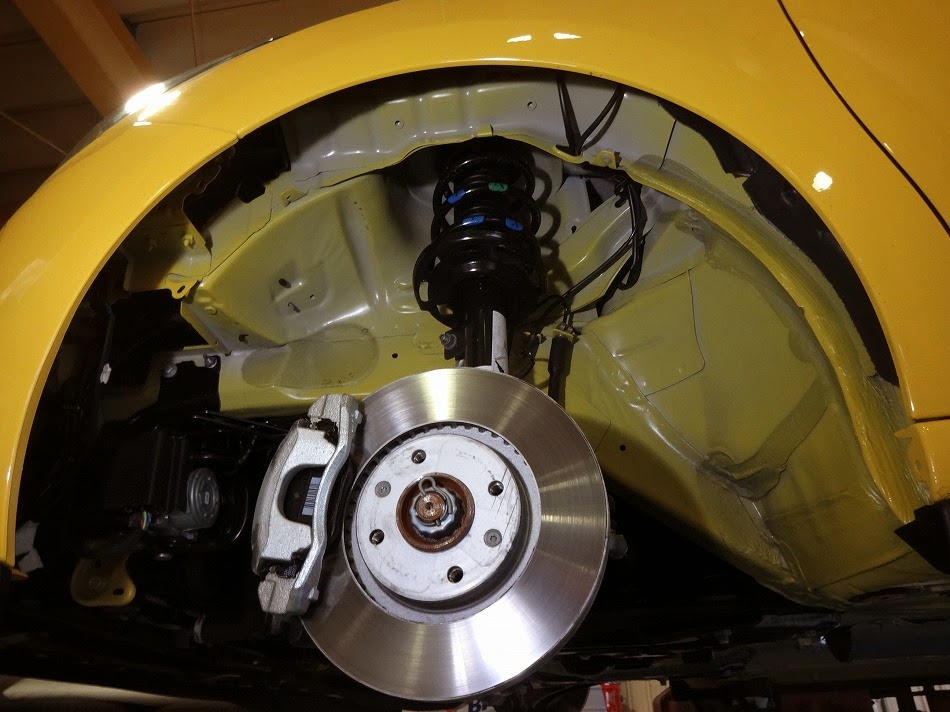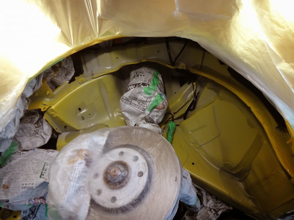 タイヤハウスの中も ボディと同色,ほとんどカバーに覆われていますが,カバーを外しての増量コースで作業は進みます。