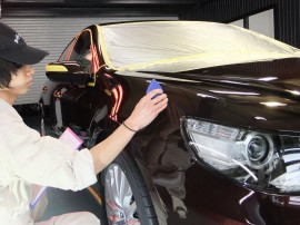 マスキング前にフロントガラスへ撥水ガラスコートの施工です。窓ガラスの撥水コート,お客様に人気の商品でもあります。