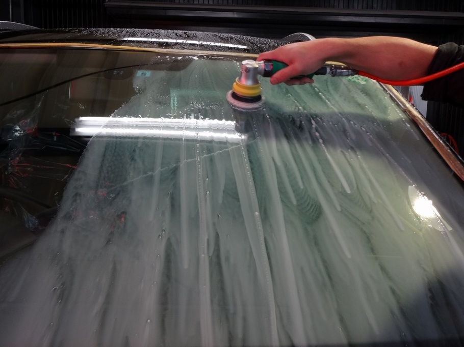 ガラス撥水コートの下地処理.. 油膜や汚れ,時にはシミの付着などを除去してコート剤の塗り込む準備をします。