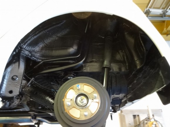 フロント,リヤとも しっかり塗り込んで一日乾燥ののちカバーを元に戻します。これだけ厚みのある被膜で覆うので錆の発生防止だけではなく,走行音などを抑える効果もあるので走りも快適になります。
