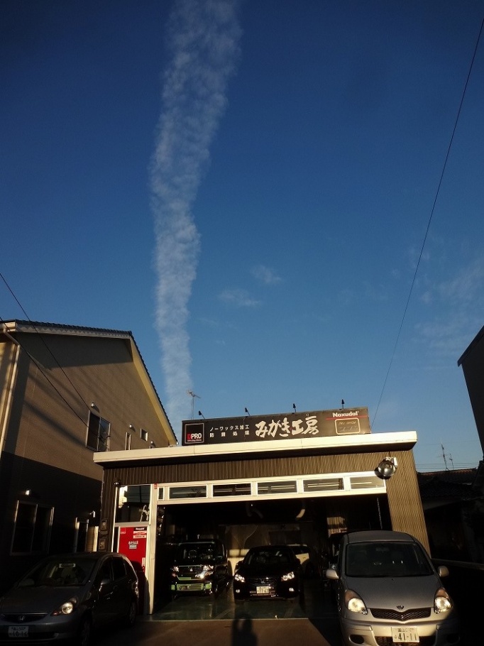 日に日に秋が深まっていきます..空は気持ちの良い青空が多く見られます。雲の形を見ていても季節が感じられます。先月のある朝のみがき工房高岡ですが,煙突から上がった煙のような雲が出ていました。(9月28日早朝)向かい側にも見られ,空一面に続いている長~い雲,飛行機雲なんでしょうか?よくわかりませんが透き通った青空に気持ちよさそうになびいていました。