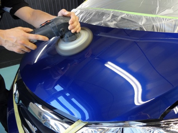 新車の塗装もしっかり磨きます。勿論ただ磨くのではありません,塗装の状態に応じて塗装の肌調整を行うのです。新車が更に光り輝く 新車を超えた新車に変わっていくんですねー…