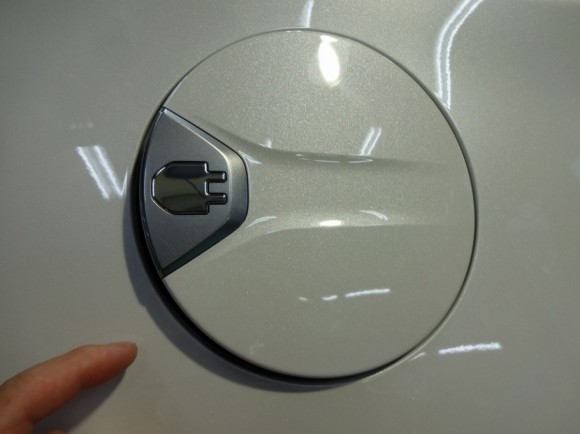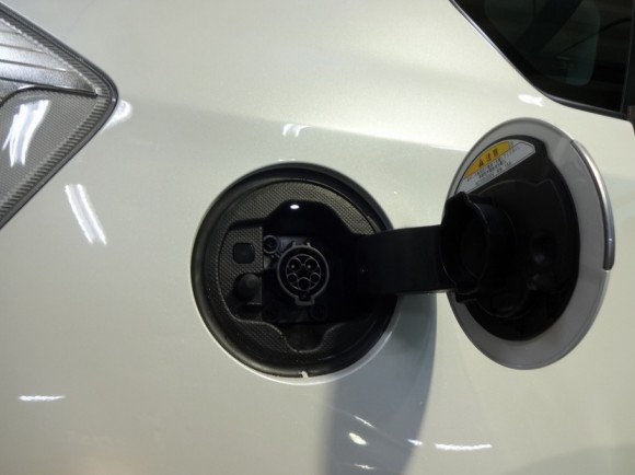 お車の左右に給油口があり 片側にはコンセントのマーク? 開いてみると専用充電コードの接続口が…初めて見るので何か新鮮です。 ああ電気自動車? って感じですかねー?