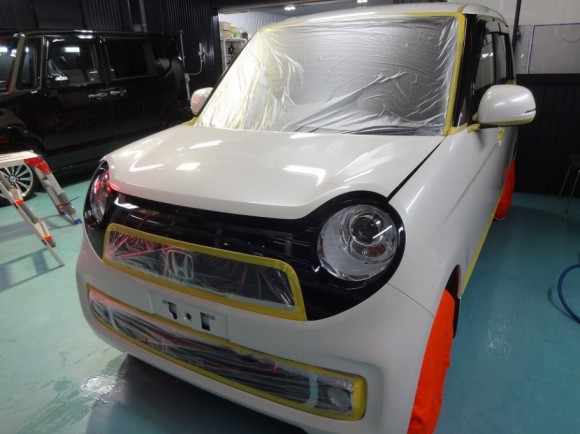 お洒落なヘッドライト,テールレンズは プレミアムな軽で新発売された ホンダ N-ONE です。新車の保護フィルムを外し,洗車,マスキングを経て新車塗装の肌調整へと…